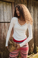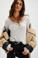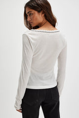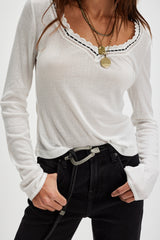 So simple with sweet details, this classic long sleeve is featured in a sheer ribbed cotton knit with ribbon-adorned lace trim.
