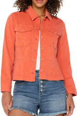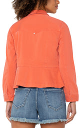 Update your wardrobe with this fabulous Peplum Jacket. This beautifully papaya hued jacket is made with premium soft stretch twill fabric. A touch of flirtiness mixed with edge gives you styling versatility!