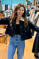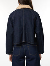 The classic barn jacket is updated in dark denim with a cropped, loose fit and a soft faux-shearling collar.