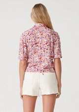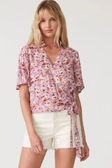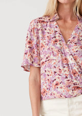 A short-sleeved bohemian wrap top in a purple and pink floral print.