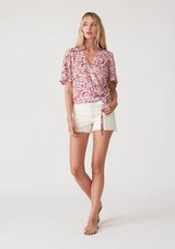 Ultra-flattering and sweet, posey is a relaxed wrap top featuring a pretty all-over floral print. With short sleeves, a v-neckline, and a wrap front with side tie closure, it's an effortless day-to-night style that pairs well with denim.