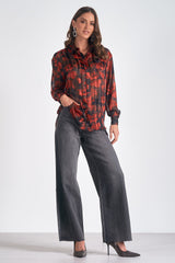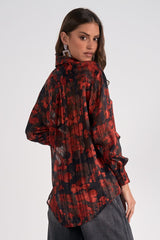 finished in a bright and beautiful red and black, this blouse boasts red florals throughout, with a metallic touch for a fun finish. It starts at the collared neckline, transitioning into a button down closure, with structured cuffs to keep it smart.