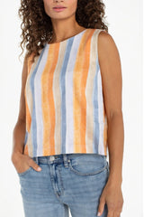 Bright and effortless, this sleeveless shell top features bold orange and blue stripes and a charming button-back detail. Lightweight and easy to style, it’s perfect for warm days or layered looks with a touch of playful sophistication.