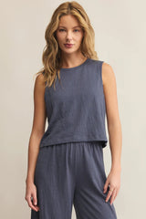 A laid-back essential with a textured twist, this sleeveless crewneck top hits at the waist and channels effortless cool. Its slub knit fabric and muscle tank style make it the perfect pairing for high-waisted denim or layered looks.