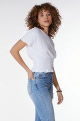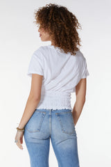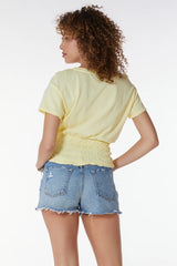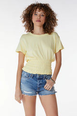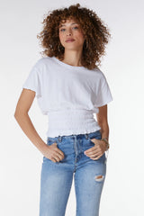 Made in lightweight jersey fabric, this top has ultra-flattering smocking from waist to hem, a slouchy sweatshirt fit at the upper body, and short sleeves. Wear it with denim or leather pants for a put-together look.