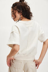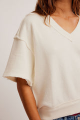 Features: Textured cotton fabrication, terry lining, V-neckline, drop-shoulder short sleeves, exposed seams, ribbed hem