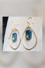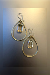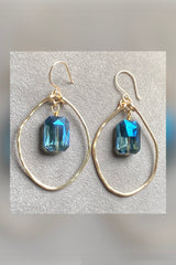 Sparkling blue, faceted crystal framed by a gold hand-forged and hammered hoop, in the classic Marble Designs Jewelry Organic style. These earrings are 3” with handmade French ear wires. Also available with champagne crystal.
