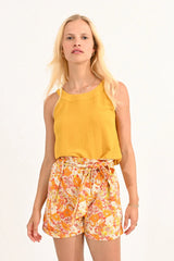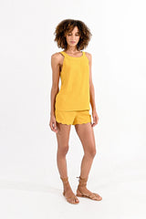 Elevate your style with our yellow mango trendy top featuring a daring deep V-neckline back and a chic banded round neckline. Crafted with attention to detail, this top exudes sophistication and allure. The rich hue of yellow mango adds an element of glamour, while the unique twisted neckline adds a touch of intrigue. Perfect for making a statement at any event, this top effortlessly combines bold style with modern sophistication, ensuring you stand out with confidence and flair. make it a perfect set with our scalloped hem shorts!