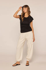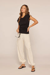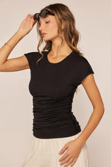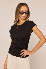 Crafted from luxurious, stretchy fabric, this top boasts elegant ruched detailing along the sides to accentuate your figure. The timeless crew neckline and cap sleeves with a subtle slit add a touch of sophistication.