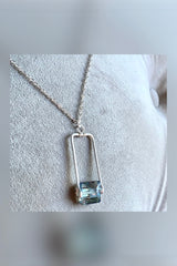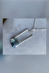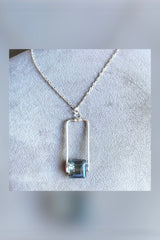 one of our favorites! unique handmade crystal necklace. A square blue crystal, wire wrapped and set in a hand forged silver rectangle frame.