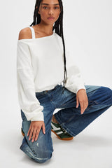 Features: Cotton thermal fabrication, wide scoop-neckline, dropped dolman sleeves with elasticated cuffs, exposed seams, banded hem