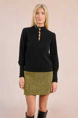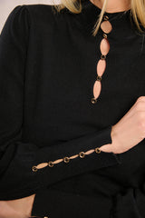 The sweet escape keyhole cutout sweater in black blends feminine detail with modern edge. crafted from a lightweight knit, this tunic style silhouette features a raised neckline with delicate keyhole cutouts, each adorned with decorative beads for a romantic touch.