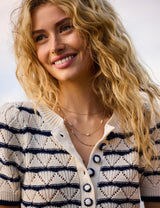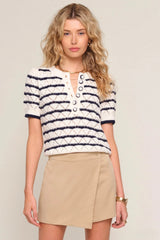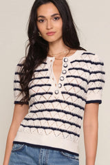 The Verano Top is a short sleeve knit with a henley detail. It features a pointelle stitch with a stripe layout throughout and crochet buttons.