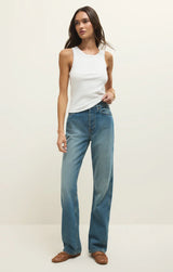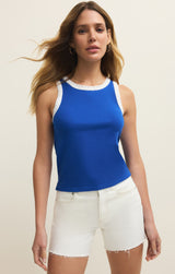 it’s all in the details with feather rib fabric and crochet trim at neckline and arms. We love this updated tank with high waist denim or linen trousers.