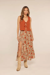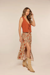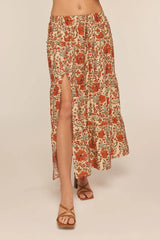 Embrace carefree bohemian vibes with this gorgeous floral maxi skirt. Its elasticated waistband and charming slit detail add a touch of casual elegance, while the warm, earthy print and lightweight fabric ensure all-day comfort.
