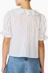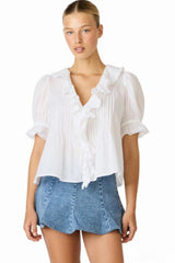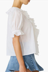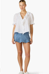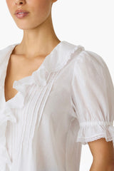 The Steve Madden Lyric Top in antique white is a dainty, feminine blouse designed for effortless romance and everyday ease. Crafted from breathable 100% cotton, this lightweight top features an oversized, loose fit and voluminous balloon sleeves that add soft movement. A cleverly hidden button front transforms into a front ruffle when the collar is styled open, creating subtle, flirty detail without fuss.