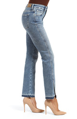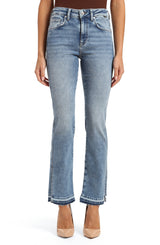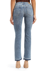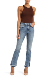 Maria is our high-rise jean that fits slim through the hip and thigh before ending in a flare. With an edgy slit at the hem, this pair brings a modern update to a nostalgic silhouette.
